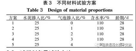 試驗中各組成材料的配比以干土質量為標準, 氣泡摻入比為氣泡質量與干土質量的比值, 水泥摻入比為水泥質量與干土質量的比值, 含水率指摻入水之后包含原料土中的水的質量與試樣干土質量的比值。試驗重點考察不同類型的發(fā)泡劑對河道淤泥氣泡混合土物理力學性質的影響, 試驗配合方案如表 3 所示。